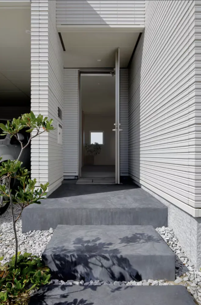 玄関はあえて光を抑え、リビングの風景へと、 よりドラマチックに展開するための空間としている。