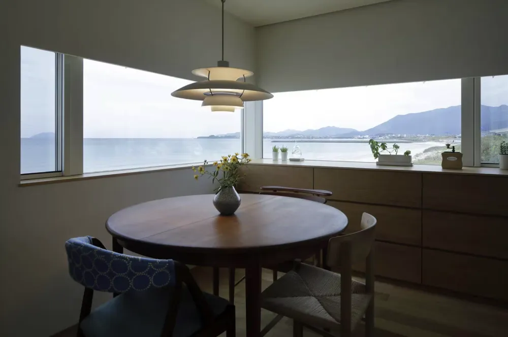 ダイニングのコーナー窓。その窓からは、西側の海だけではなく、 順光によって美しい光景を見せる、北側の山も望める。