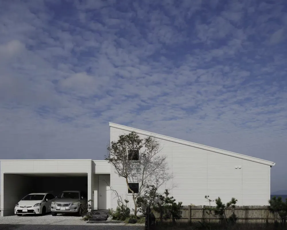 道路側から見るシルエットは、片流れ屋根を採用した平屋のゆったりとした佇まいとし、 青い空に美しく映える白い外壁を施している。