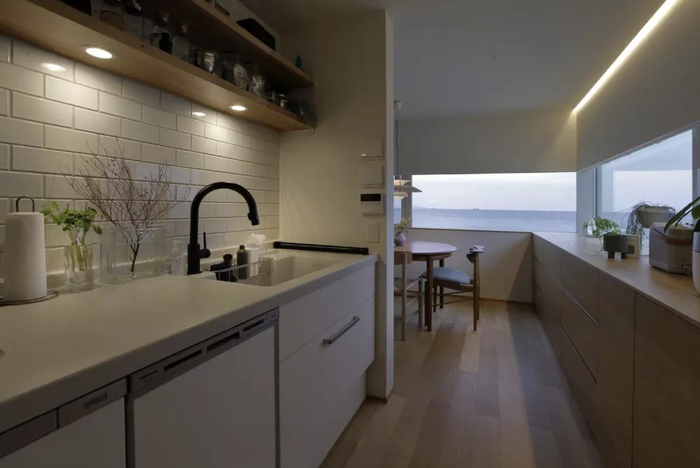 潔感ある白のキッチンは前面にサブウェイタイルを施し、ダイニングから覗く青い海の眺望ともマッチ。 洗練された印象に。北側に設置した収納カウンターがダイニングまで伸び、空間のつながりを持たせている。