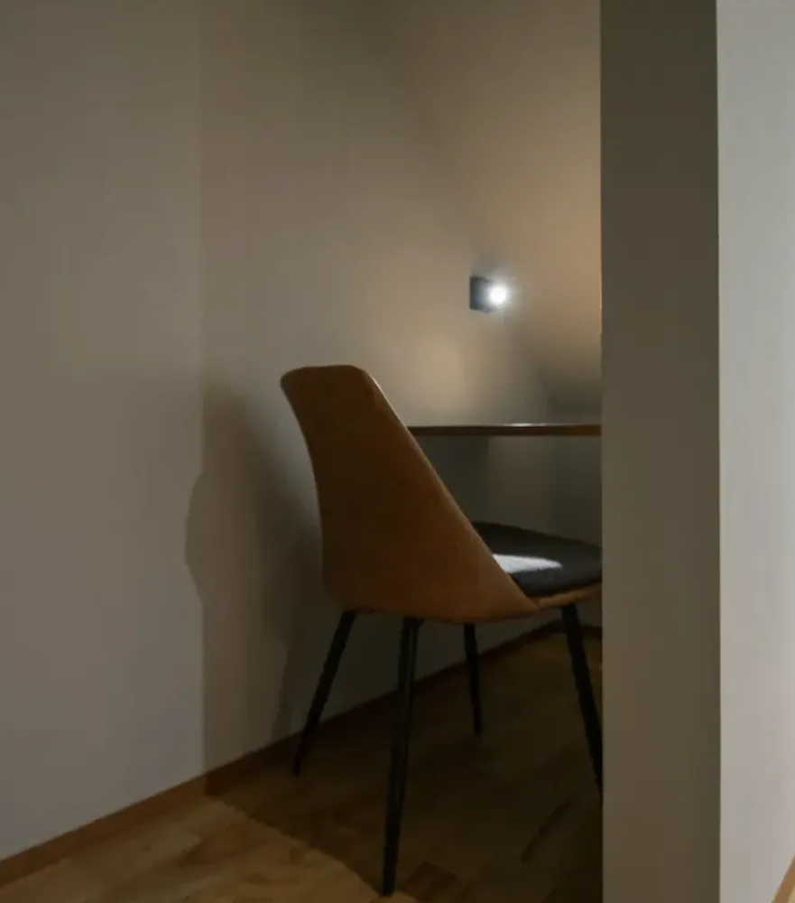階段下の空間を有効活用した書斎コーナー。ほどよいこもり感で集中しやすく、リモートワークにも快適に対応します。