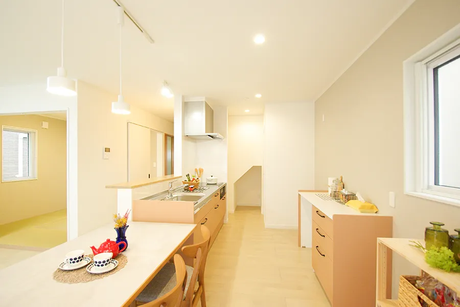 4LDK、1階に和室、シューズクローク、パントリー、キッチンダイニング並列型、ワークカウンターetc...注文住宅で採用の多かった要素を十分に取り入れて33.5坪で実現したプランです。是非ご体感ください。