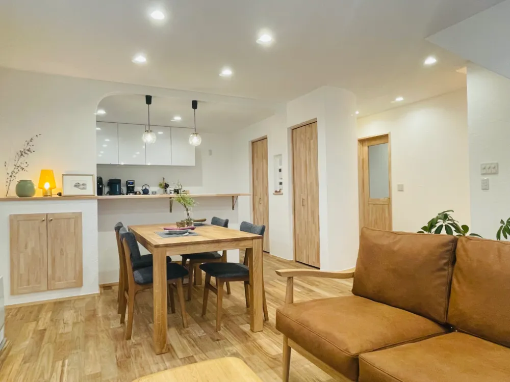 チークの無垢材を使用したリビング。 壁は天井や収納の中もすべて「しっくい」の塗り壁です。 「しっくい」には消臭効果があるため、室内でワンちゃんや猫ちゃんと過ごす方も安心です。