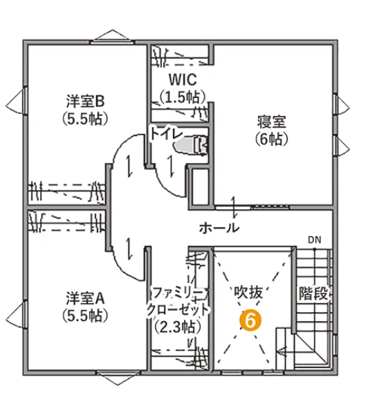 ②15.4帖のLDKはコンパクトながら吹抜けを設けており、天井や上部の壁など高い位置に窓があるので開放的な空間になります。