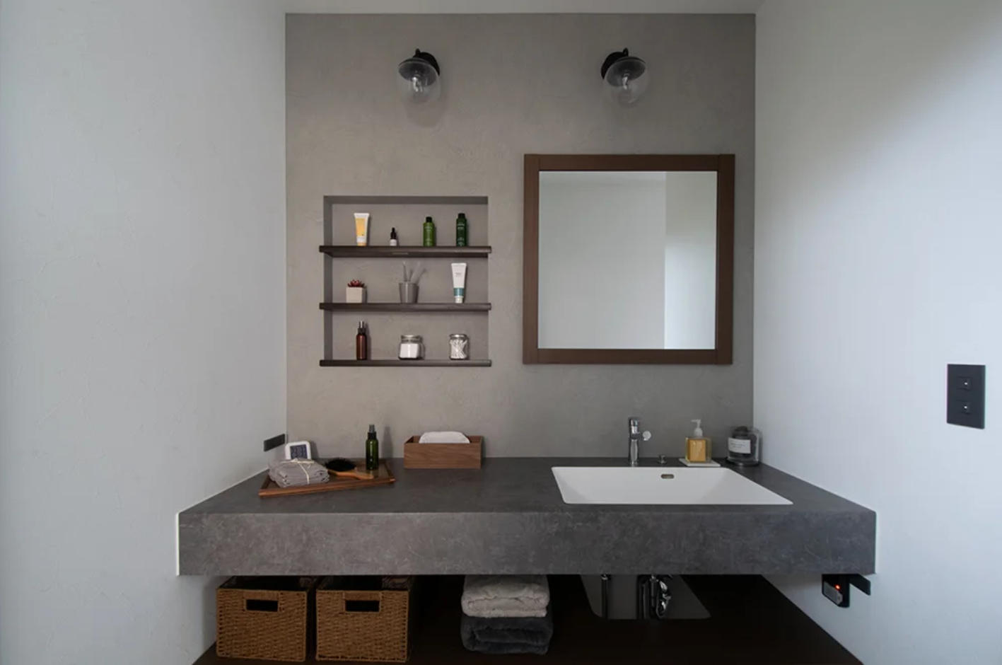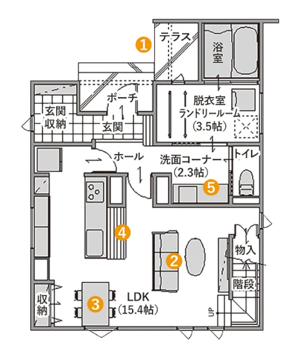 ⑤玄関側の洗面台は、帰宅後の照明のスイッチ・扉の開閉といった家の中のものに触れる前に手洗いできる衛生的なスタイル。