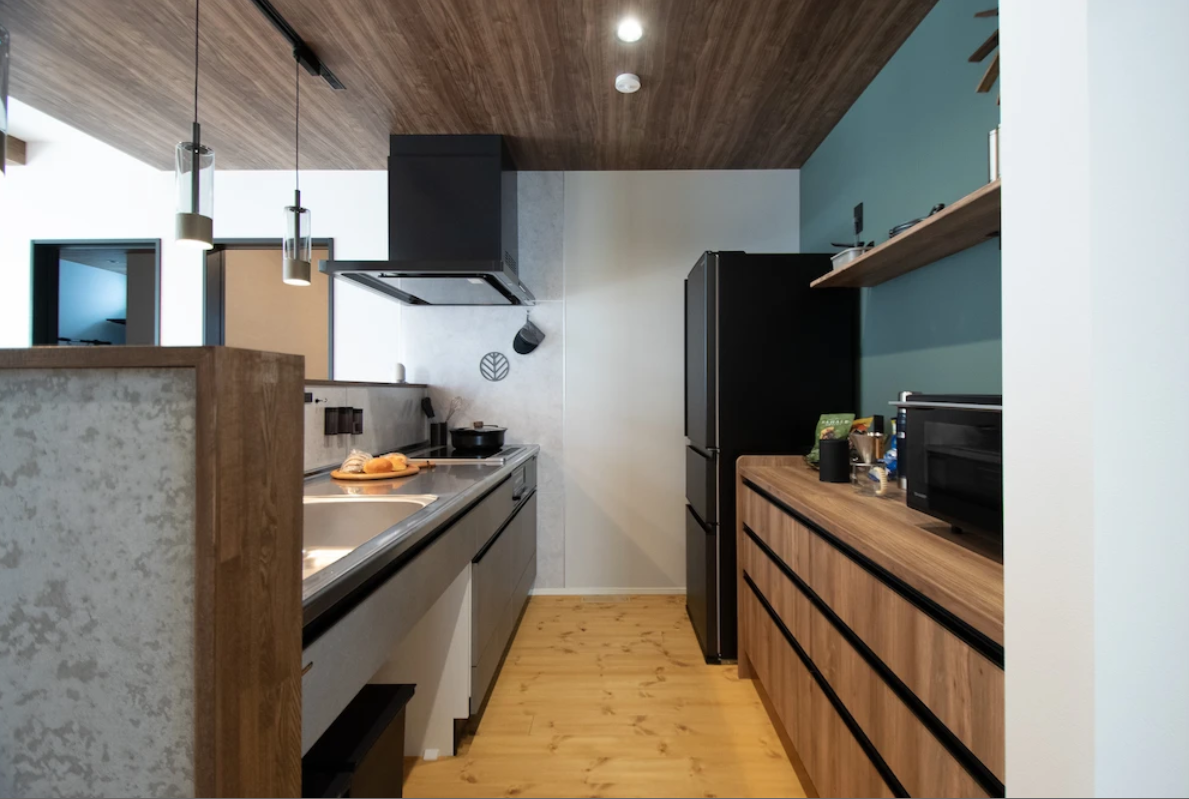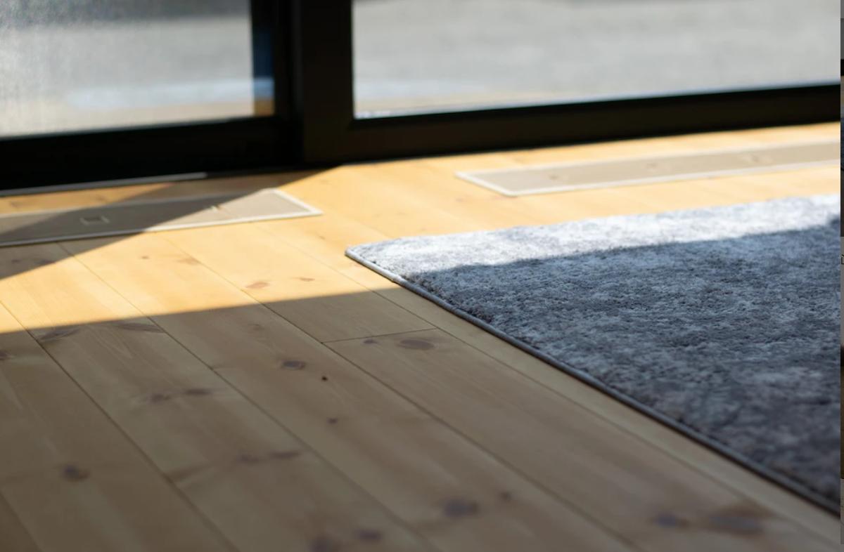 ④カウンター下にはエアコンを設置。このエアコンからでる風を床や天井を通して各部屋や廊下の通気口へと流しているので家全体も暖かくなります。