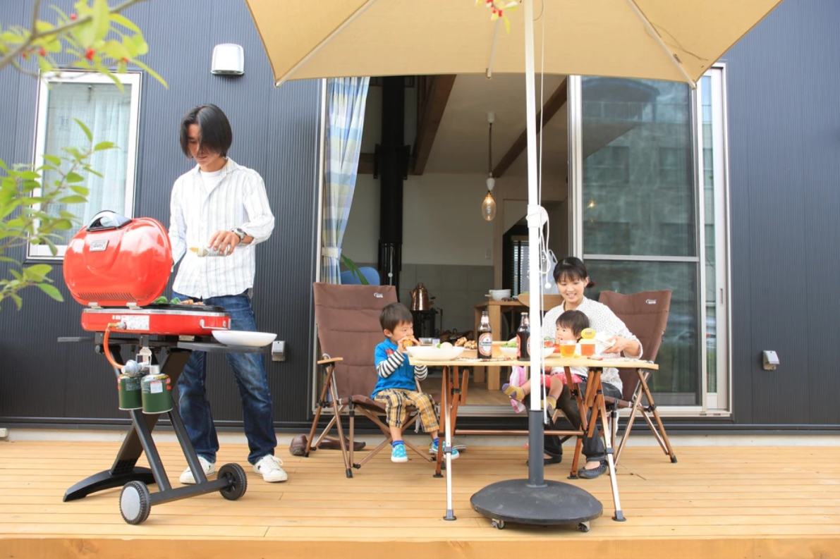 ①玄関わきに小さなテラスを設けました。自転車置き場や、表からは見えない場所なので大き目の置き配にもOK。