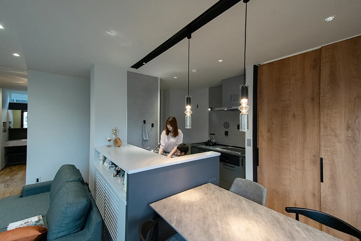 ④ ダイニングテーブルと横並びのキッチンで調理~食事がスムーズに行う事ができます。お子様が勉強をしているときも様子を確認しやすいメリットがあります。