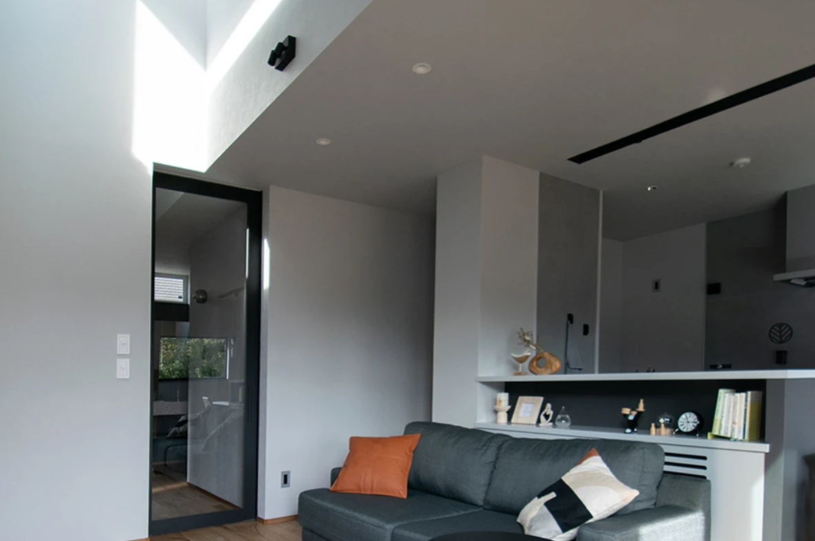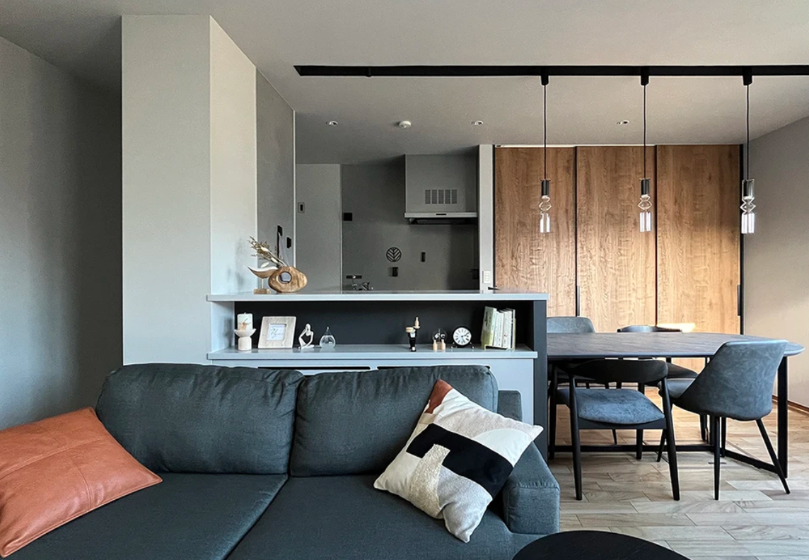 ① LDKにはワイドサイズのガラス窓を配置し、開放的で明るい空間になりました。来客時や外の天気もすぐに分かります。